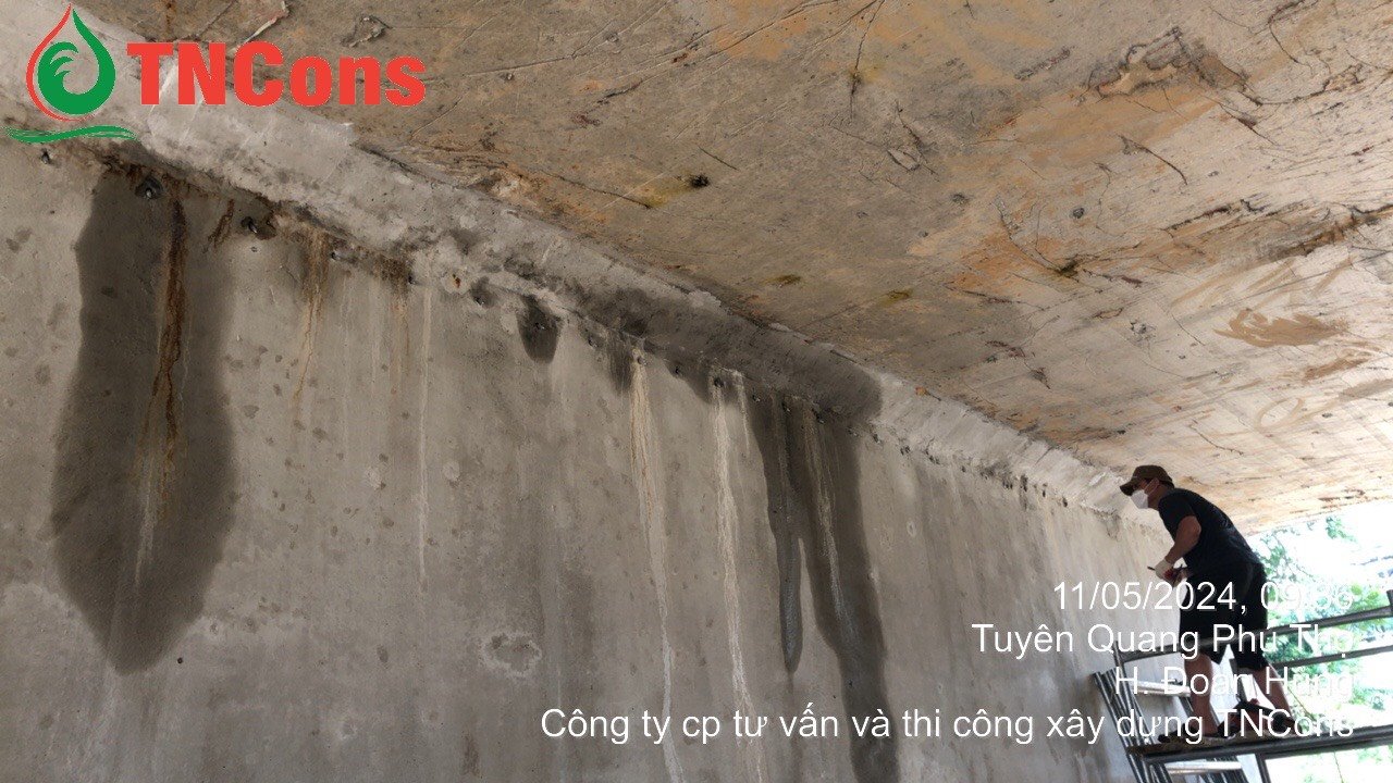 Đội ngũ kỹ thuật TNCONS tiến hành khảo sát hiện trạng, xác định chính xác vị trí thấm và khu vực mạch ngừng cần xử lý. Công tác dọn dẹp được thực hiện kỹ lưỡng: